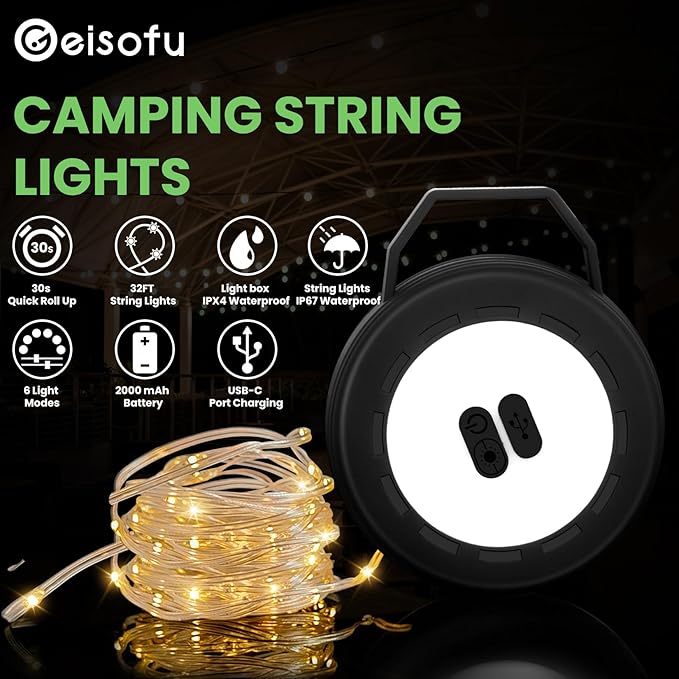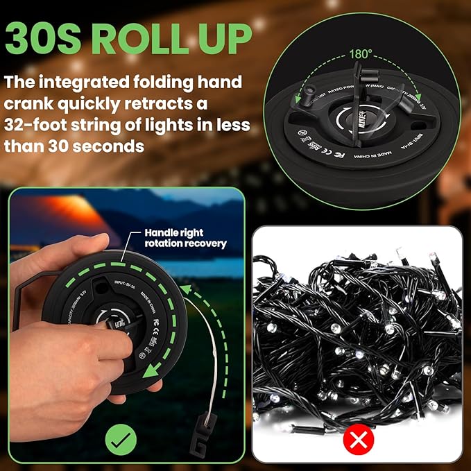 - Simple Storage and Portability: This stowable camping string lights features a new design with an integrated folding hand crank mechanism that allows the full 32 feet of string to be quickly stowed in just 30 seconds. Weighing only 8.6 ounces, this tent lights for camping hanging is easy to carry and store, and the LED lights strips measures only 4.7 inches in length and width and 1.5 inches in height when tucked away.