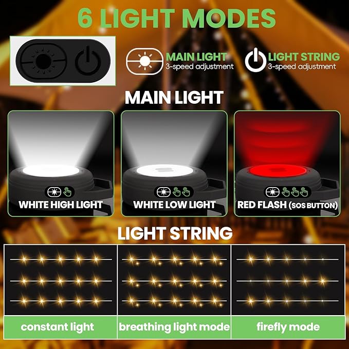 - Lighting Patterns and Adjustment Methods: LED portable camping light has 6 light modes, main light: white high light, white medium light, white low light, red light (SOS button); light string: constant light, firefly mode, breathing light mode. Adjustment method: Main light and camping string light have independent control buttons, press to switch light modes.