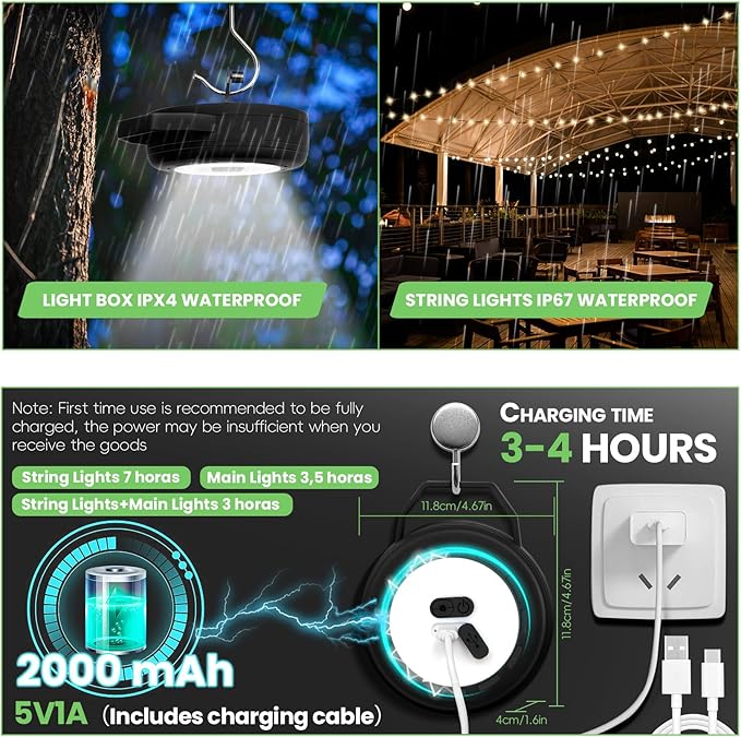 - USB-C Rechargeable Battery and Usage Time: This string lights for outside battery powered is 5V1A charging with USB-C port, built-in 2000mAh battery with charging indicator, takes 3-4 hours to fully charge. The string can work for 7 hours after fully charged, 3.5 hours for main light, 3 hours for string+main light, it can also be used when charging to meet your needs for camping ambient light.