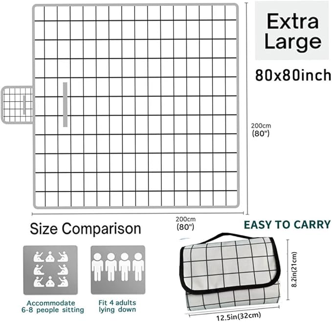 - 80*80 Inch Oversized for 4-7 Adults: Giving your children and pets a large area to play. Oversized For 4-7 Adults To Sit - Measurers 80 x 80in for 6-8 adults to sit comfortably, or 4 to lay across. Large picnic blanket is good for 4-6 to sit comfortably or 3-4 to lay across.