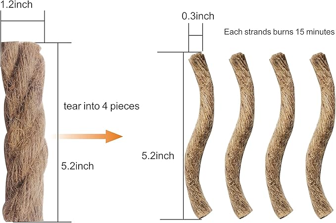 - The wax- infused natural hemp cord works in all weather conditions, it is 1.2” x 5.2”, it can be 4 strands. Unwind the braided fire ropes and fray them by twisting the fibers a part until they are very fine and fluffy.