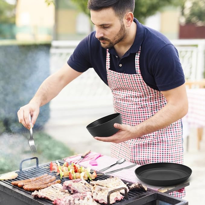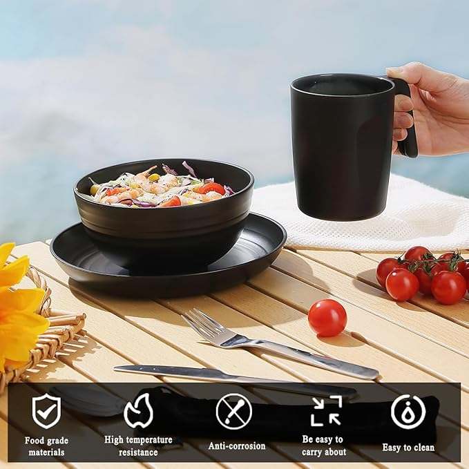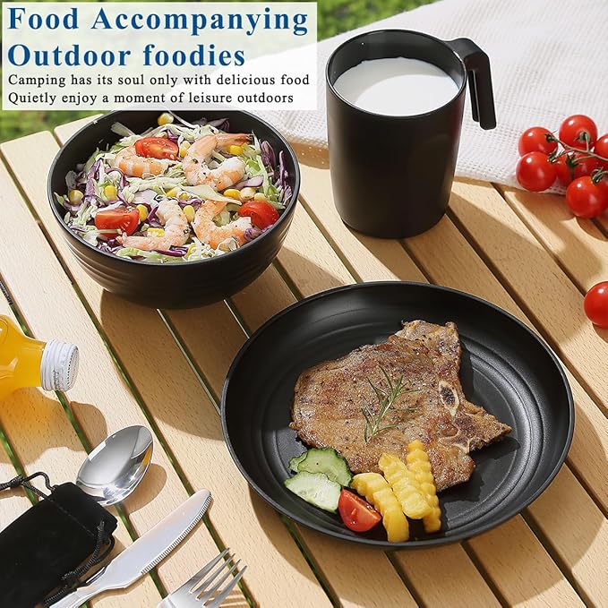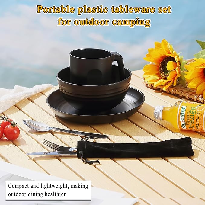- HIGH QUALITY: The plates and cups of this camping set are made of pp material, BPA free, non-toxic and odourless. They are lightweight, unbreakable and sturdy, the stainless steel cutlery is made of high quality stainless steel, sturdy and durable.