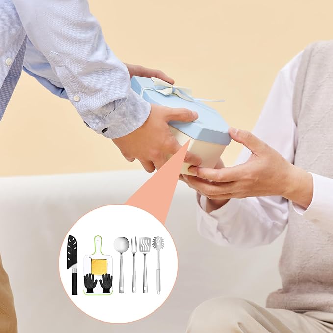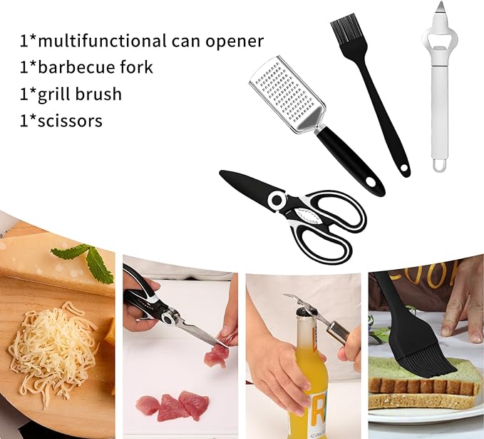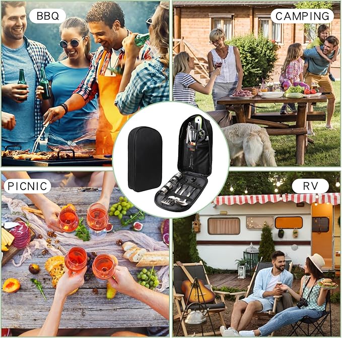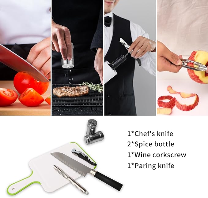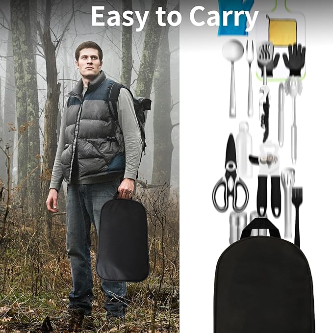 - Camping Cooking Utensils Set:Camping accessories include chopping board*1, spatula*1, soup ladle*1, bread clip*1, scissors*1, wine corkscrew*1, chef's knife*1, barbecue fork*1, spice bottle*2, paring knife*1, apron*1, towel*1, non-slip gloves*1 and storage bag*1. This is a complete set of camping utensils to meet all your needs.