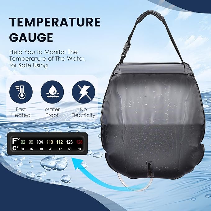 • Heat Absorbing Design: The portable shower is made by high-quality and leak proof materials which are safe to human health. Utilizing sunlight, the camp shower heats water to 113°F (45°C) in 3 hours for a warm outdoor shower without the need for electricity. Built-in thermometer allows you to monitor the water temperature for maximum comfort.