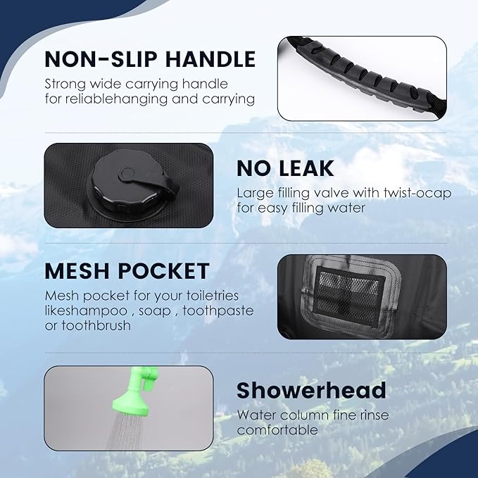 • Tough and Reliable: The portable camp shower is made of heavy-duty PVC material, Easily hang the portable shower bag using the sturdy handle on trees or other supports at your preferred height and simply fill with water, hang in an area with plenty of sunshine, and enjoy a warm shower easily!
