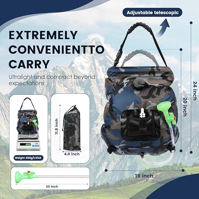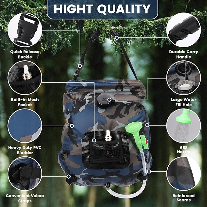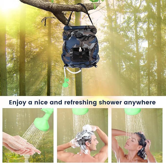 • Widely Used: This compact and lightweight camping shower bag is designed for convenience on the go. Ideal for outdoor camping, travel, hiking, backpacking, pet cleaning, plant watering, fishing, hunting, beach trips, and more. Elevate your outdoor experiences with refreshing camping shower wherever you are.