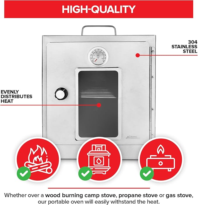 - High-Quality: Our camping stove features lightweight yet durable 304 stainless steel panels that retain and evenly distribute heat. Whether over a wood burning camp stove, propane stove, or gas stove, our portable oven will easily withstand the heat.