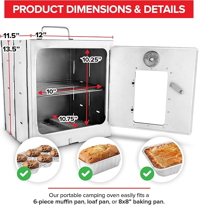 - Dimensions: Our portable camping oven measures 12"Wx11.5"Dx13.5”H when assembled and folds down to only 3"H! The inner cooking space is 10”Wx10.25”Hx10.75”D and perfectly fits a 6 piece muffin pan, loaf pan, or 8x8 cooking pan.