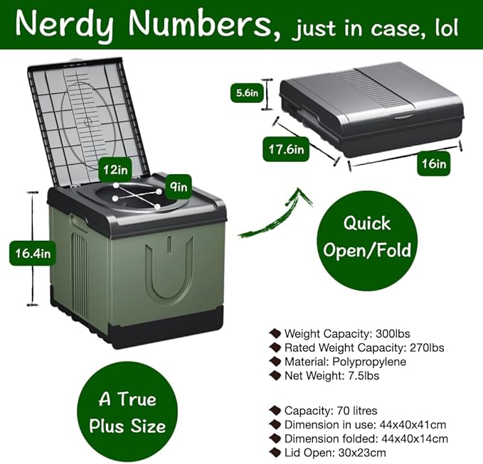 - This xl portable toilet is bigger and taller than average: 18x16x16in, load capacity 300lbs.