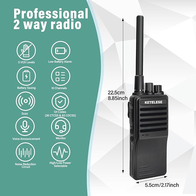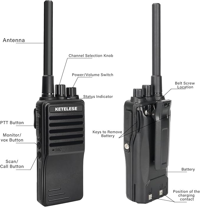 - No Battery Worries: KETELESE KP01 rechargeable walkie talkie has a large-capacity battery of 2000mAh, which can be used for a whole day when fully charged. Compared with other two way radios 1000mAh battery or dry cell battery, it lasts longer and saves money.