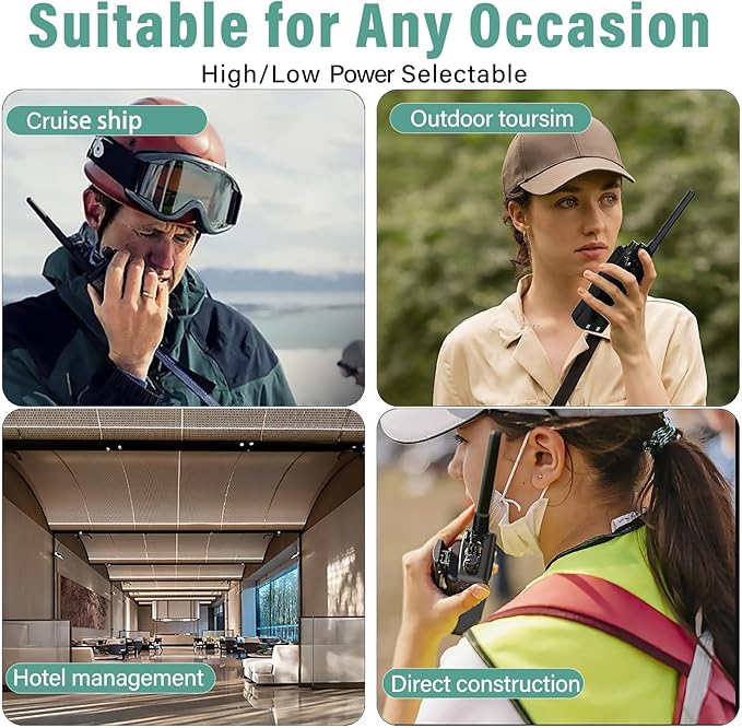 - High-Quality Extra Large Speaker & Noise Reduction Design: Brings you crystal clear sound, while the radios are equipped with headphones. Ideal for use outdoors or in noisy work environments. Walky talky can be used in commercial situations or outdoor events; such as restaurants, schools, cruise ship, travel, factory production, police offices, hunting, camping, hiking, skiing, etc.