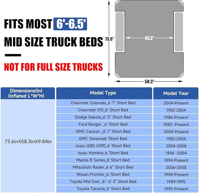 - MIDSIZE Truck Bed Mattress: This air mattress is only suitable for 6-6.5' MID SIZE pickup truck beds. It is NOT for full-size truck beds. Please ensure that your truck is a midsize truck before buying.