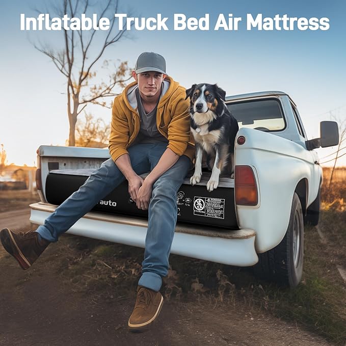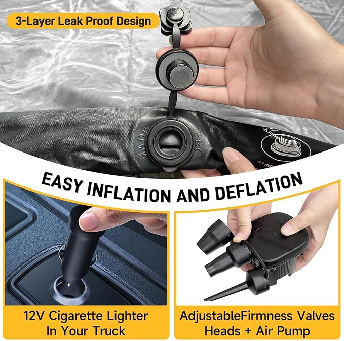 - High-Quality Materials: Our inflatable truck bed air mattress features a plush soft-flocked top surface, durable PVC construction for robust support, and upgraded 2024 extra-thick 210T grid fabric on the bottom to prevent punctures and air leakage, enhancing durability and reliability.