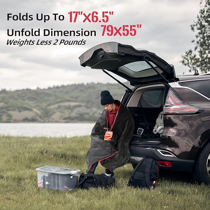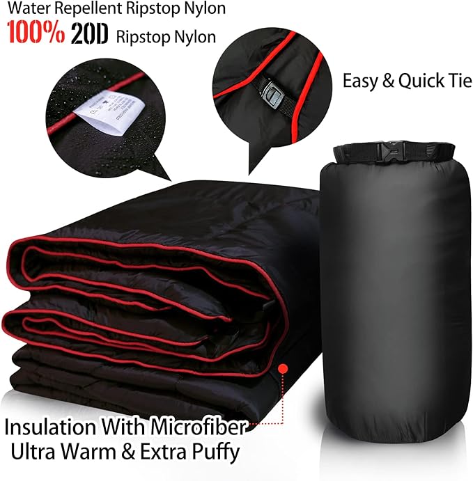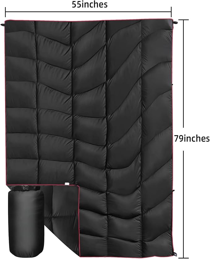 - 2.Packable Puffy Blanket: This single person camping blanket measures 80X60 inches, 15X10inches. Your purchase is including one camping blanket and one waterproof rip-stopped personalized design bag.