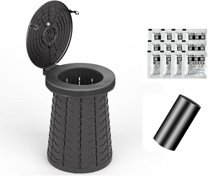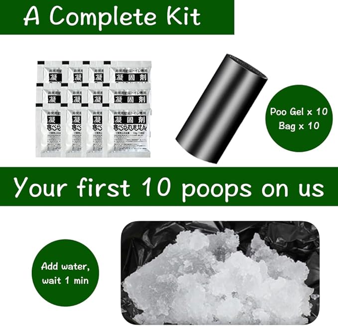 - Our portable potty is a complete emergency toilet kit: 10 packs of poo gel and trash bag included.