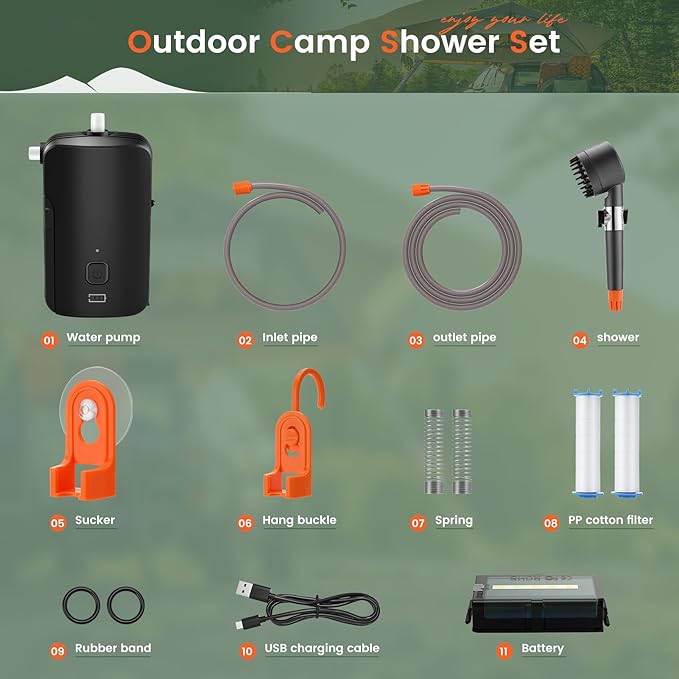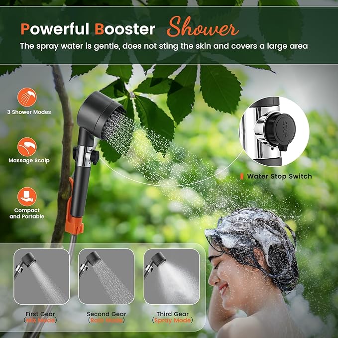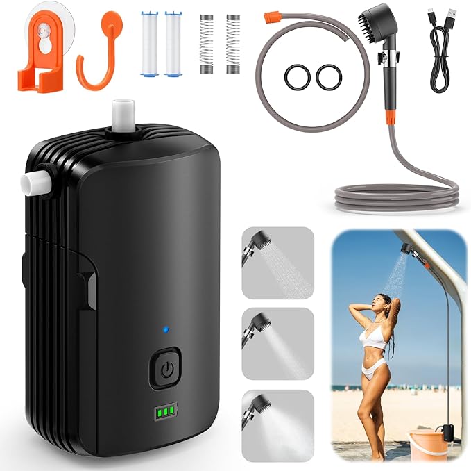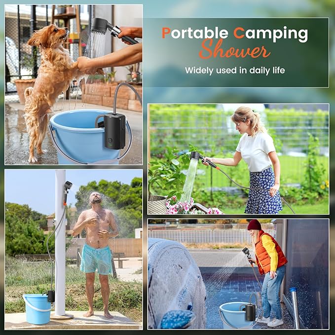 - 【Easy to Assemble and Operate】Our electric outdoor shower is very simple to use, just connect the tube to the pump and shower head, place the suction tube in the bucket, then press the button to turn on the pump, and it will create a steady, gentle shower flow. This camping shower can be used to rinse your feet after playing at the beach, and is also ideal for outdoor sports, hiking, children's showers, pet cleaning, garden watering, car washing, swimming, etc.