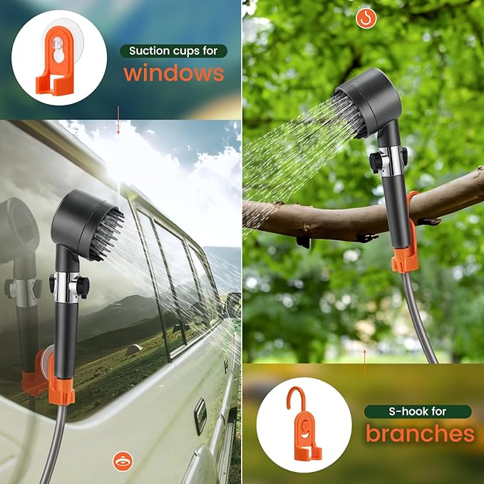 - 【New Rear Clamp Design】The portable camping shower pump has a rear clamp on the side, which can be firmly fixed to any bucket or branch by simply pulling it apart, effectively preventing tilt or floating resulting in an inability to absorb water. Our shower pump can reach up to 2.5m to meet the needs of different heights of 0.5m-2.4m. It comes with a suction cup and an S-shaped hook, which can be used to attach it firmly to any flat surface, or to hang it from a tree using an S-shaped hook.