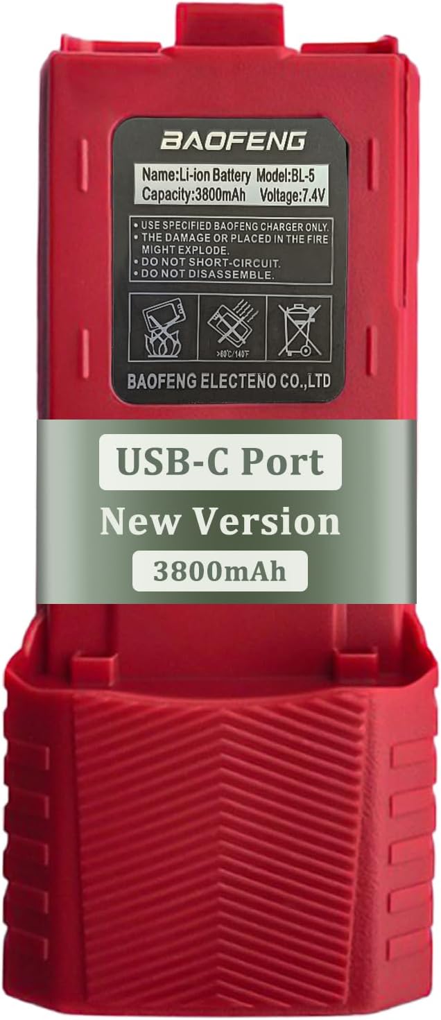 BAOFENG UV-5R Radio Battery Extended 3800mAh USB-C Charging Red Replacement for BF-F8HP New Version for BF-F8 Rechargeable Bl-5 Two Way Radio Battery