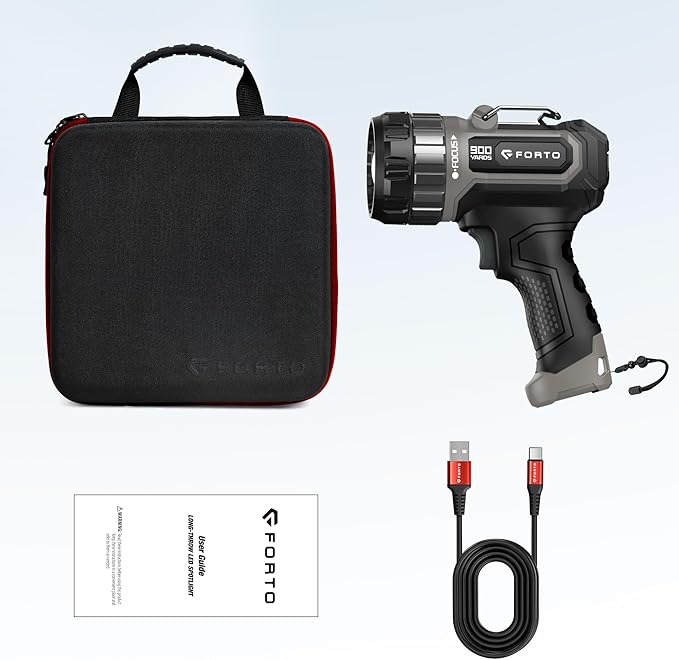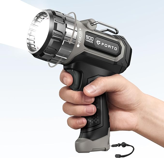 - Durable ABS Construction & High Lumens: Made with robust ABS material, FORTO spotlight is highly durable and drop-resistant. It provides a maximum brightness of 1400 lumens and can run up to 8 hours on a single charge, ideal for long workdays or adventures. Includes a hands-free stand for versatile placement and use.