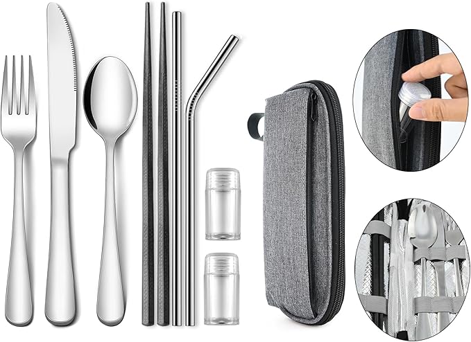 - Reusable travel utensil set - This camping set includes a knife, a fork, a spoon, a pair of fiberglass chopsticks, two straws with silicone tips, two mini spice jars and a portable bag.