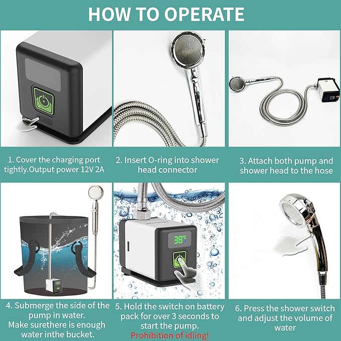 - Outdoor Camping Essential - Equipped with a 12V Brushless Motor and Stainless Steel Shower Kit, Easily Pressurize for a Mobile Shower Room. Say Goodbye to Sweaty Nights, Enjoy Refreshing Camping, and Sleep Peacefully.【WARM TIP】Please install the sealing washer inside the hose correctly to prevent water leakage.