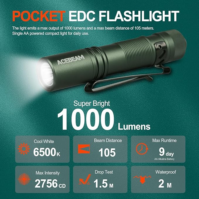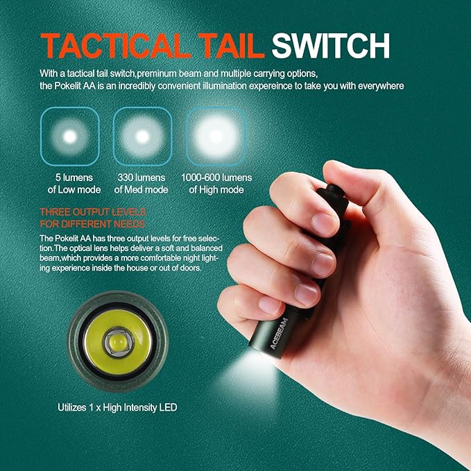 - Super Bright Flashlight: Pokelit AA edc flashlight adopted high performance LED and a cool white 6500K color temperature, with a max output of 1,000 lumens, and a 105 meters beam distance.