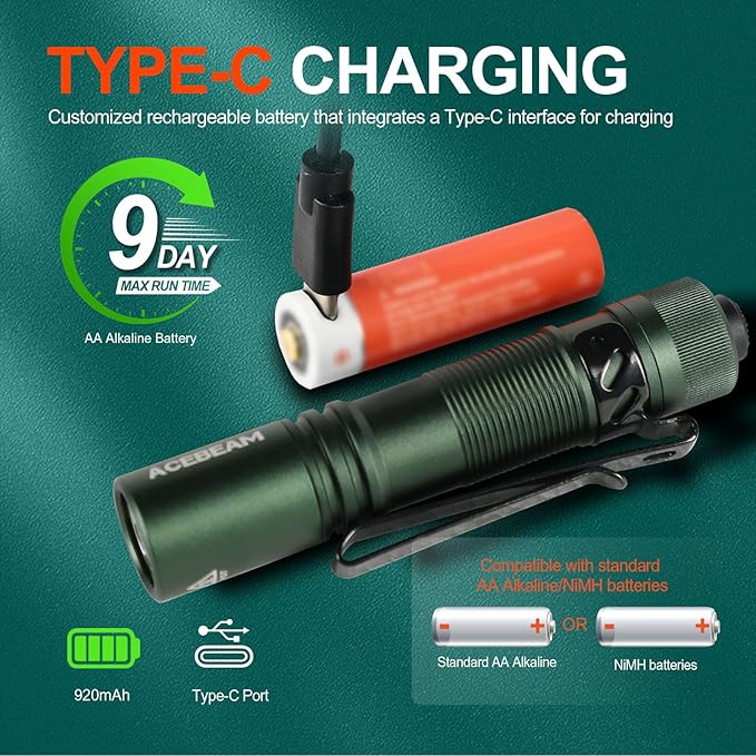 - Special Feature : Recahrgeable, compatible with any AA battery type, 1000 High Lumens, two ss body clip, IP68