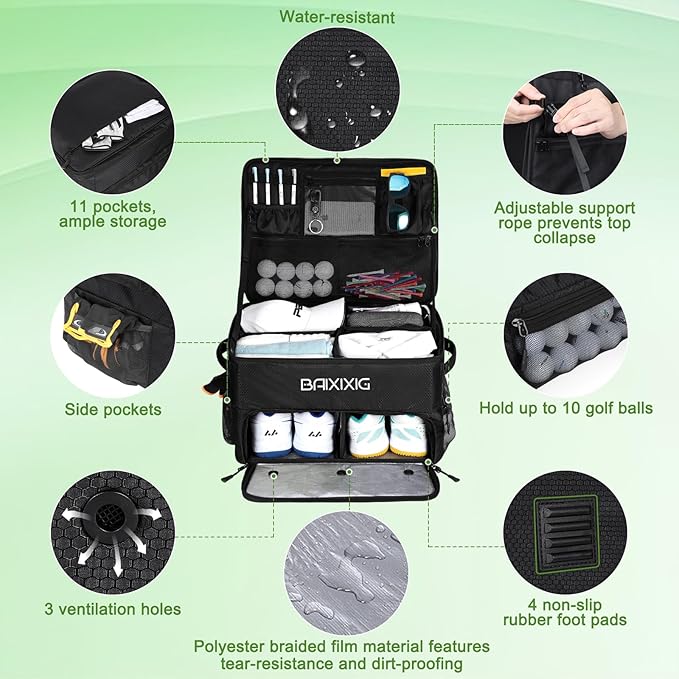 - 【Multifunctional Design】 - The golf trunk organizer is equipped with two sturdy and durable handles on both sides for easy carrying. Its bottom features four anti-slip rubber pads for stability. The shoe compartment includes three ventilation holes to keep your shoes fresh. Boasting 11 pockets, this golf storage bag expertly combines multifunctionality and professionalism.