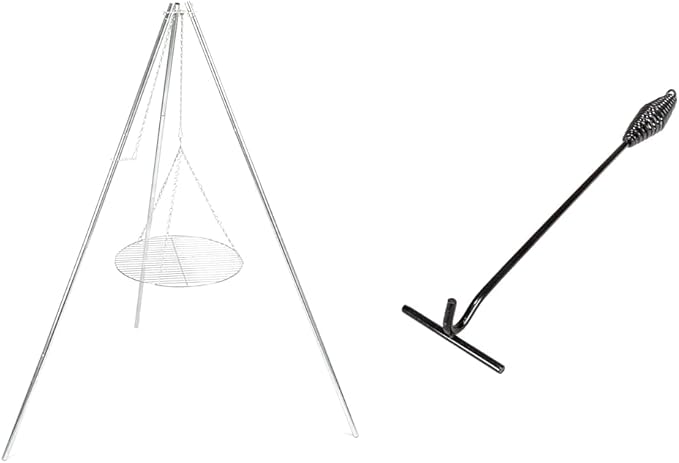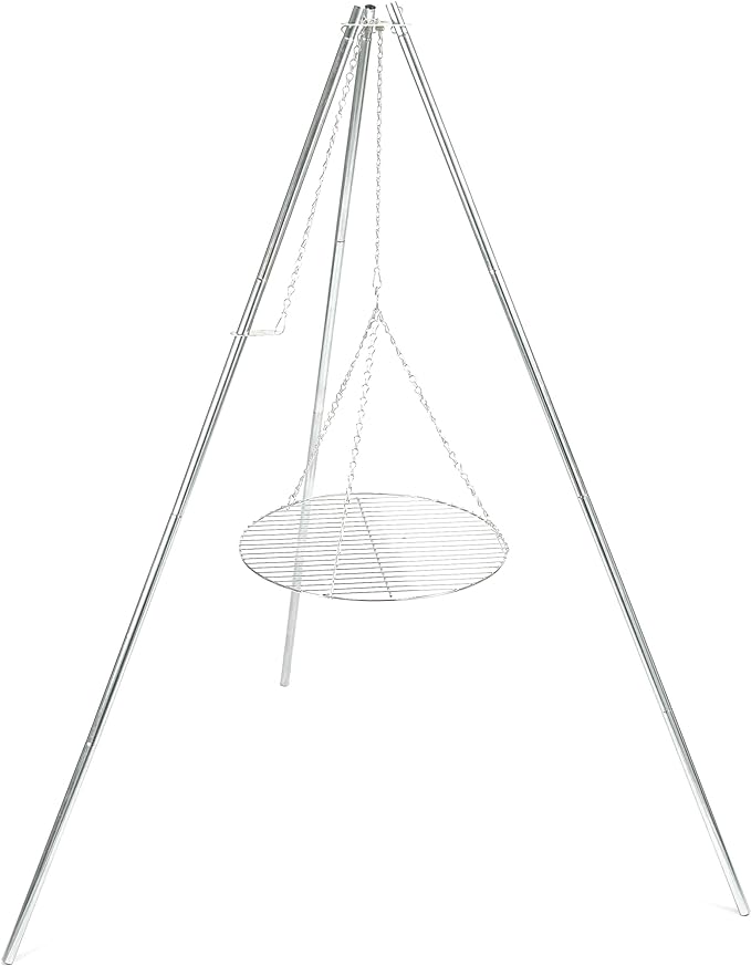 - Sturdy three leg tripod design with 18 inch adjustable grill for even cooking.