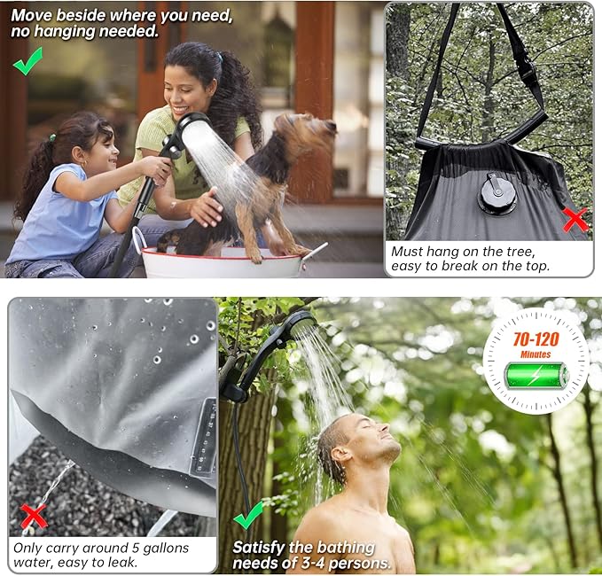 - 𝗠𝗲𝗲𝘁𝘀 𝗢𝘃𝗲𝗿 𝟯 𝗣𝗲𝗿𝘀𝗼𝗻 𝗦𝗵𝗼𝘄𝗲𝗿𝗶𝗻𝗴 - This portable shower for camping has built-in 6000mAh battery, which provides up to 120 minutes of battery life for showing. Satisfying about 3-4 person showering under fully charged. You can charge it through your phone charger, laptop's USB output or car's USB output.