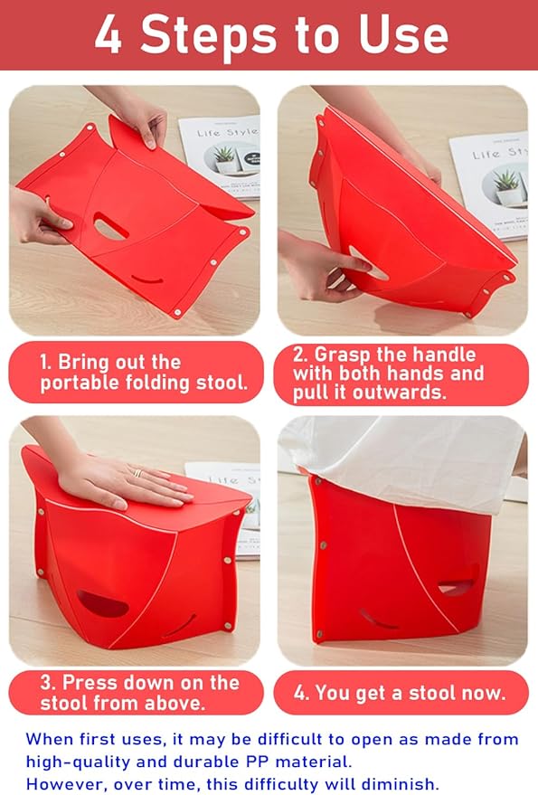 - [4 Steps to Use] Step 1: Bring out the portable folding stool. Step 2: Grasp the handle with both hands and pull it outwards. Step 3: Press down on the stool from above. Step 4: You get a stool now. When first uses, it may be difficult to open as made from high-quality and durable PP material. However, over time, this difficulty will diminish.
