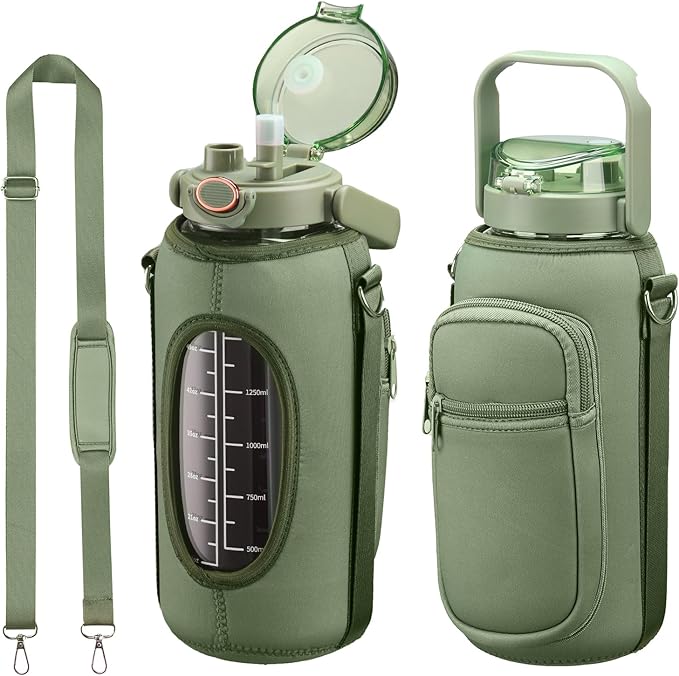 - Glass Water Bottle With Sleeve and Strap: This glass water bottle with straw is designed with high quality 5mm Neoprene sleeve to protect water bottle from slight bumps and absorb sweat to avoid dripping on table or seat. It’s an all-in-one water tracker bottle, water bottle sleeve with 2 pockets to storage phone, card,airpods, key and motivational water bottle with comfortable padded shoulder strap & wrist strap for hands free carrying. You can adjust the strap ensure a snug fit