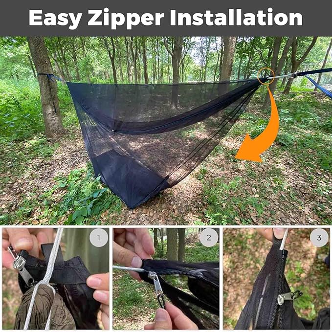 - Easy and Quick Setup: No need to remove your hammock for installation. This hammock mosquito net features a U-shaped zipper design that installs just like a jacket zipper. Simply attach the zipper at both ends of your 11/12ft gathered end hammock, and zip to the center. Secure the top with snap buttons to the ridge line for added stability. Note: Suitable for hammock with ridgeline.