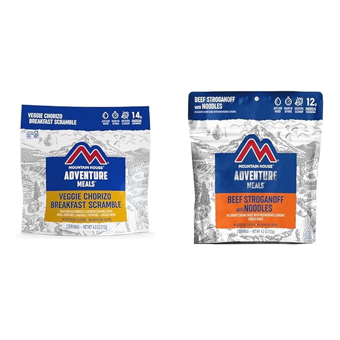 Mountain House Veggie Chorizo Breakfast Scramble 2-Servings & Beef Stroganoff with Noodles 2 Servings Freeze-Dried Backpacking & Camping Food Bundle