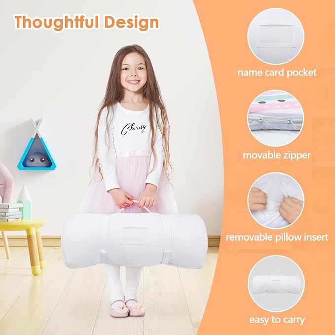 - Portable & Easy to Clean; Slumber sack is equipped with velcro straps and handles, which can be easily rolled up and lifted, very convenient to carry; with a see-through name slot, don't worry about getting the sleeping bag wrong or lost.And it is machine washable. Warm tip:Recommend to take the pillow out before washing.