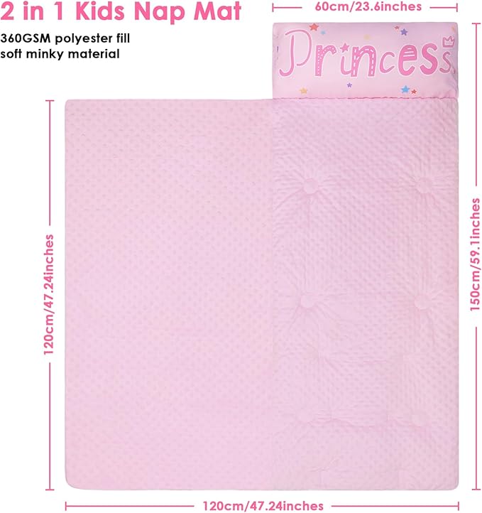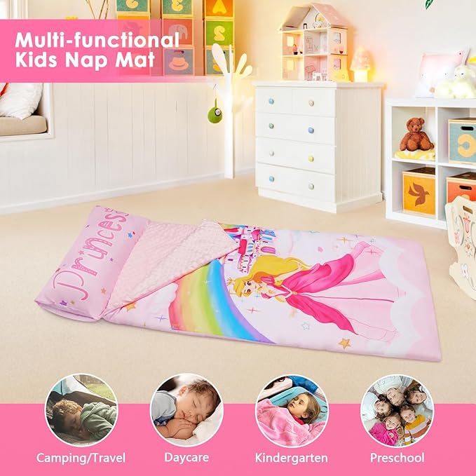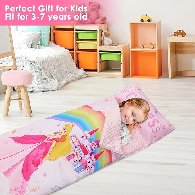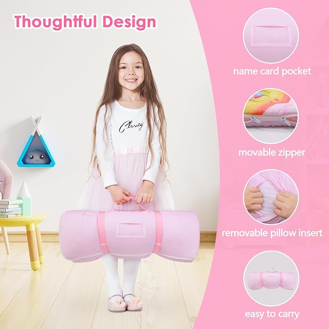 Kids Sleeping Bag Toddler Nap Mat with Removable Pillow, Large Foldable Sleeping Bag for Girls Boys, Easy Clean Slumber Bag with Double Zip for Camping School Preschool Daycare, 59×24 inch