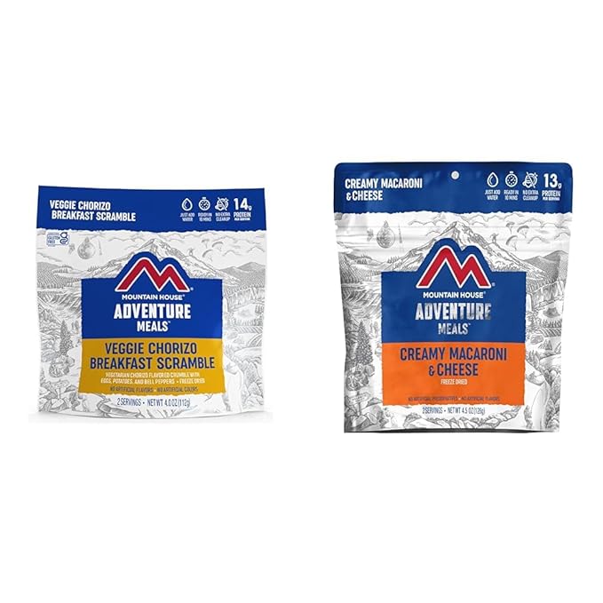 Mountain House Veggie Chorizo Breakfast Scramble 2-Servings & Creamy Macaroni & Cheese 2 Servings Bundle