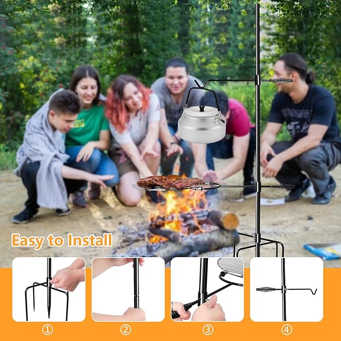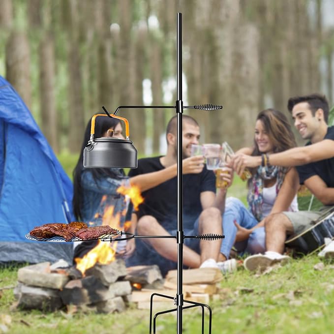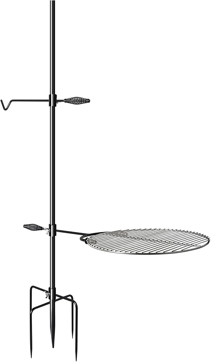 - GREAT DESIGN: This campfire grill set features a convenient hook for hanging a kettle while cooking over a campfire. The stainless steel grate provides excellent cooking performance