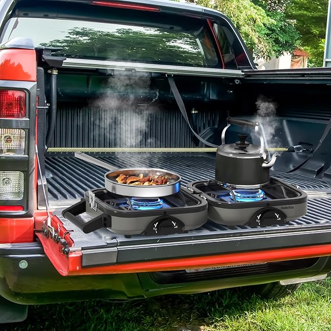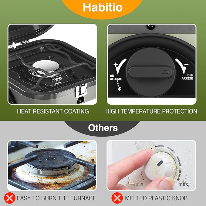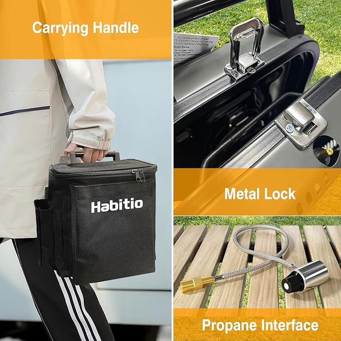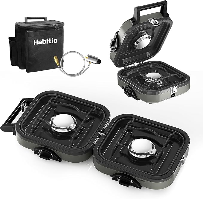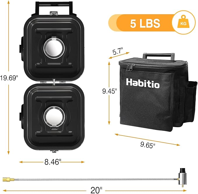 - Foldable Design: The folding size of the Habitio camping stove is only 10.5*8.5*5.1 inches, and weighs 5 lbs; It features a carrying bag that can store all accessories and propane tank, which is very suitable for storage and carrying, make your camping more convenient