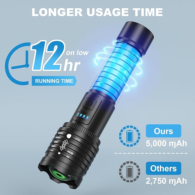 - [Rechargeable Flashlights] - 8-12 Hours Extra Long Running Time. Equipped with an upgraded 5,000 ɱAh rechargeable bāttery, this flashlights high lumens lasts up to 12 hours in low mode, takes only 4 hours to recharge, and has up to 200,000 hours of use.