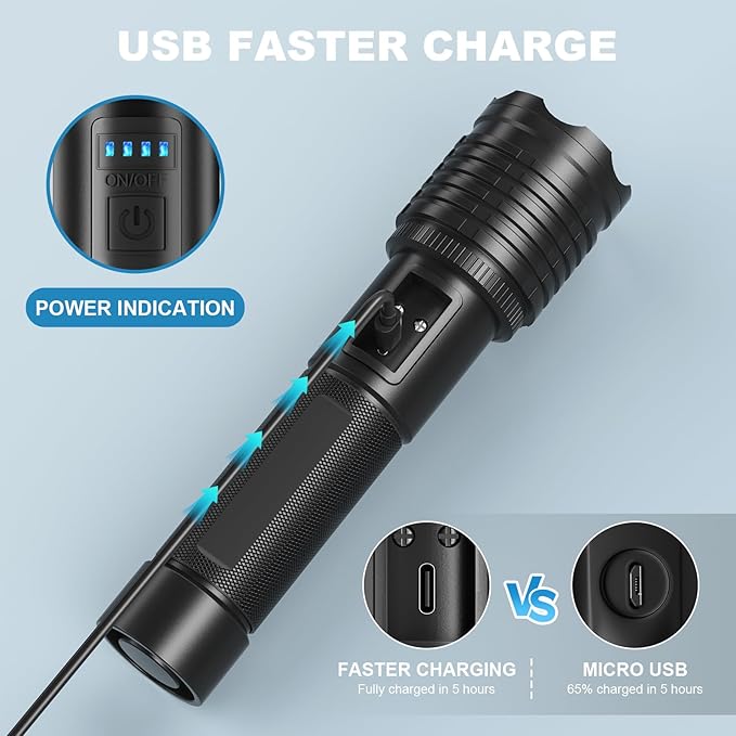 - [Quick Charge | Power Indicator] - 4 hours quick charge. Tactical flashlight high lumens built-in fast charging chip, equipped with intelligent charging interface, charging efficiency increased by more than 30%, and over-voltage and over-current protection. 4 Indicators to know the power level(25%, 50%, 75%, 100%).