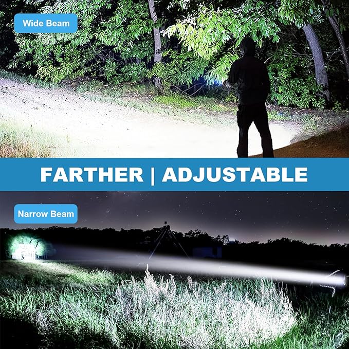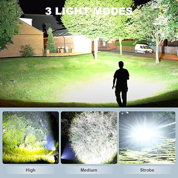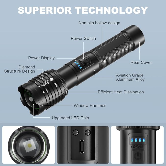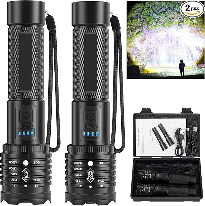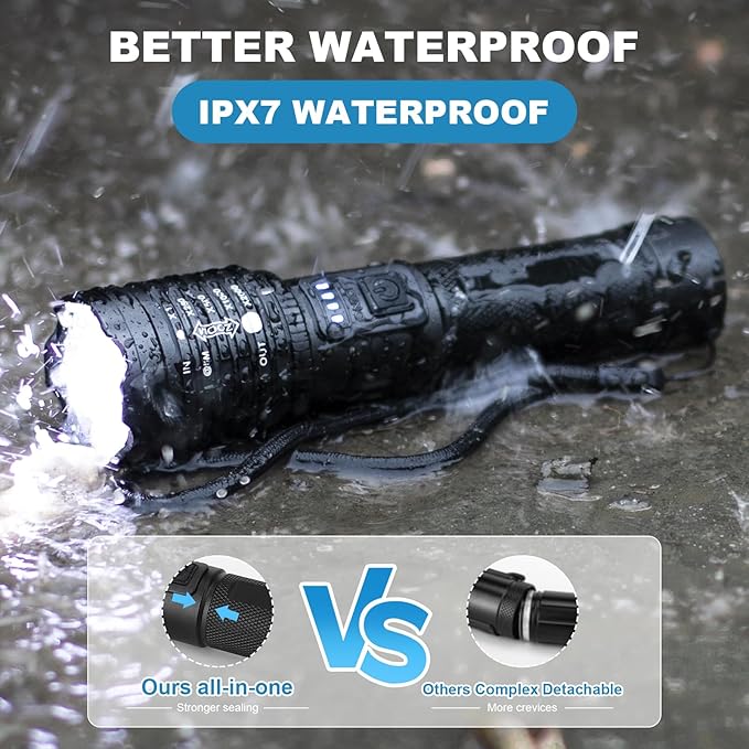 - [IPX7 Waterproof]-The flashlights for home in heavy rain or snow without worry, making it perfect for emergencies during hurricane season or power outages. Do not immerse this worlds brightest flashlight directly into water or discard the dust cover of the charging port as these can directly damage the hiking flashlight.