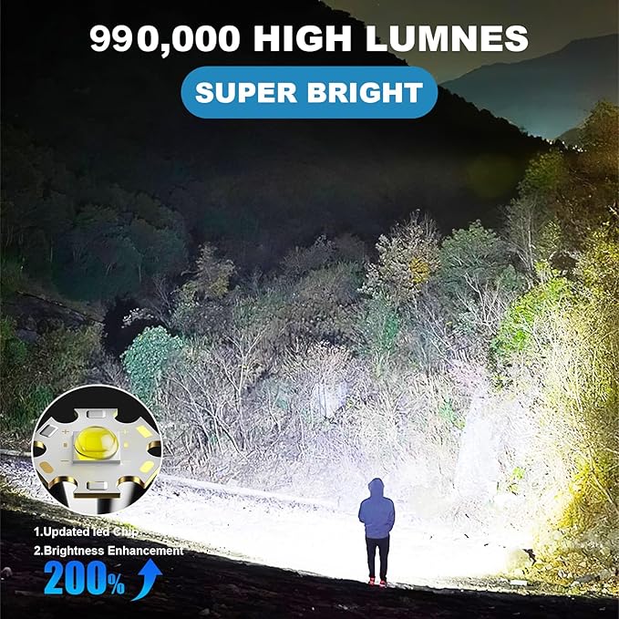 - [990,000 High Lumens Powerful Flashlight] - 30 times brighter than ordinary tactical flashlight. The high powered flashlight is embedded with super bright upgraded LED chips for 30% better performance, and the flash light delivers an amazing maximum of 990,000 lumens of brightness to clearly identify objects within 3280 feet.