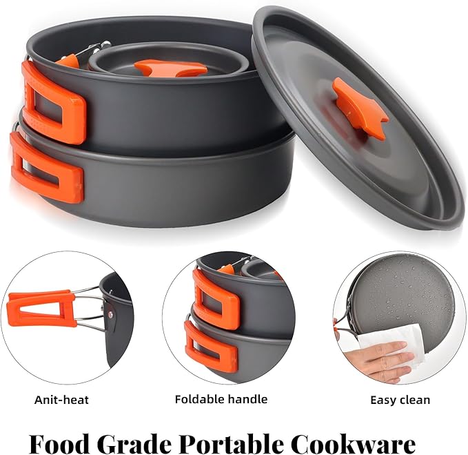 - Healthy Material Cookware - The camping cooking set is made of high-quality anodized aluminum and food-grade silicone material that is non-toxic, lightweight, high temperature resistant, easy to clean and quick heat transfer to save time and fuel