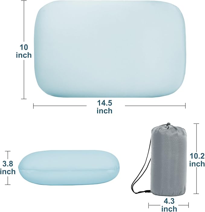- Lightweight & Easy to Carry. Camp Pillow Size: 14.5 x 10.0 x 3.8 inches. Packed Size: 10.2 x 4.3 x 4.3 inches. Camping pillow for sleeping can be fold easily into a small travel bag with adjustable buckle and drawstring design. Travel pillow is small and light which is easy to carry when you go outside.