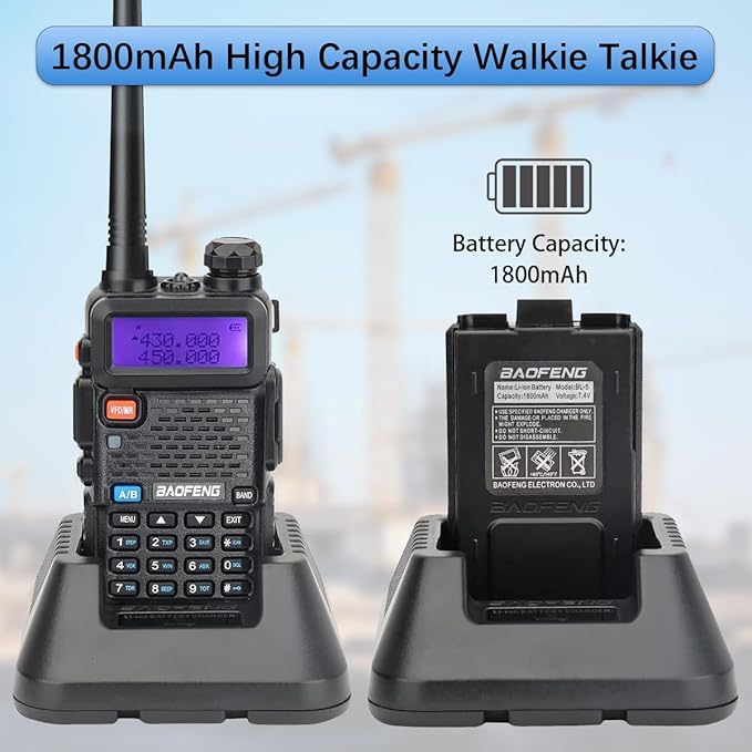 - 1800mAh Battery & 5W Adjustable Power: The rechargeable two way radio has an 1800 mAh Li-ion battery, you can trigger battery save to extend usage time. Besides, the 5R walkie-talkie has a 5W max power and is adjustable to high or low based on your needs