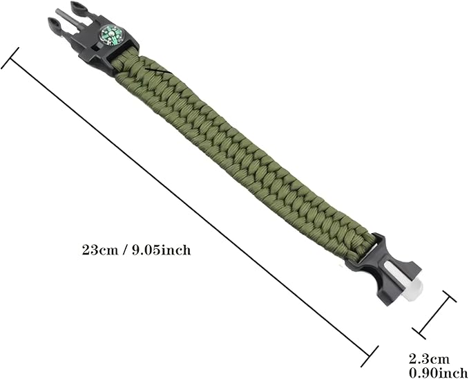 - The paracode bracelet include: Striker and Ferro rod, Compass, Loud emergency whistle, and 9 feet of military-grade paracord, it is is adjustable to fit small and big wrists adjusting from 8"-10.5" which makes it one of the best hiking accessories for campers, backpackers or boy scouts.