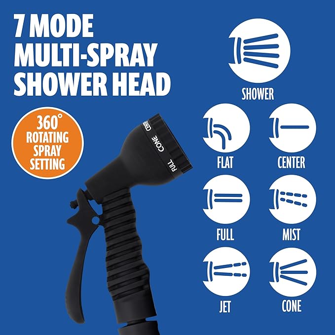 - MULTIPLE SPRAY SETTINGS - This rinse kit portable shower hose has 7 different spraying modes: Shower, Jet, Mist, Flat, Full, Cone, Center. It also comes with a Neoprene cover allowing your water to stay warm for up to 4 hours.