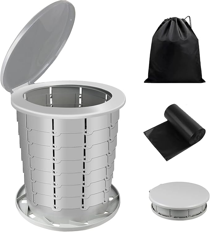 - Easy to Use: Start using porta potty for camping instantly with a single pull and twist! Securely lock the porta potty before sitting for a worry-free experience. After use, collapse into a compact disk with a counterclockwise rotation. Weighing just 2.75lbs, The camper toilet is lightweight and easy to carry in waterproof toilet bag. Perfect for all your adventures!