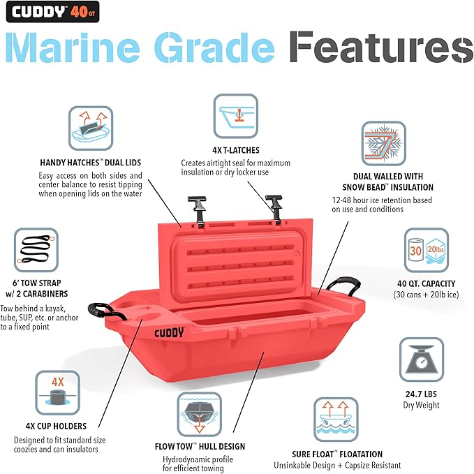 - TAKE IT ANYWHERE: Fully functioning cooler in and out of the water, the CUDDY is a must have for outdoor enthusiasts: boating, kayaking, camping, rafting, tubing, fishing, pools, sandbars or anywhere on land; Easy to tow in water while also providing a stable base on land